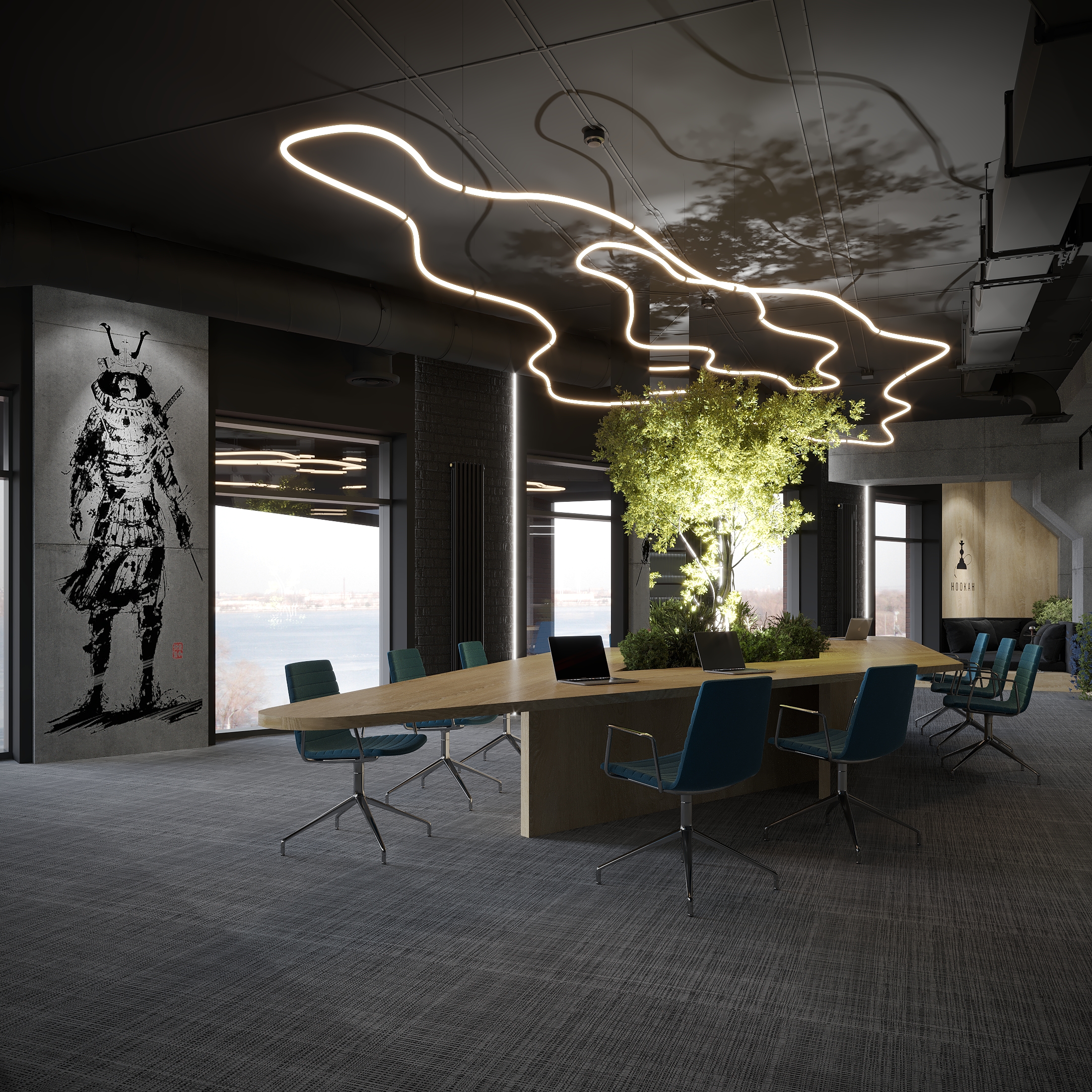 Відкрите планування, світлові сценарії та стильові акценти формують комфортне середовище для щоденної роботи й обміну ідеями.